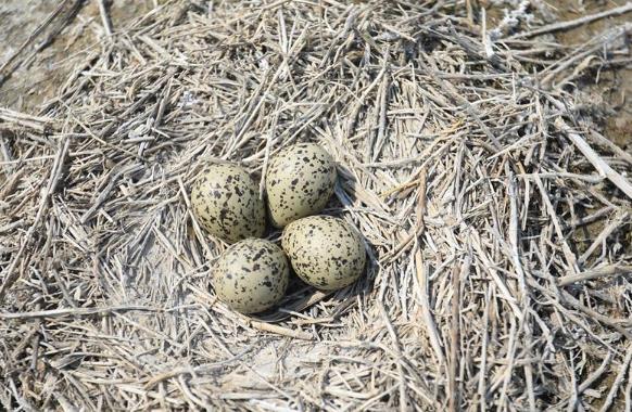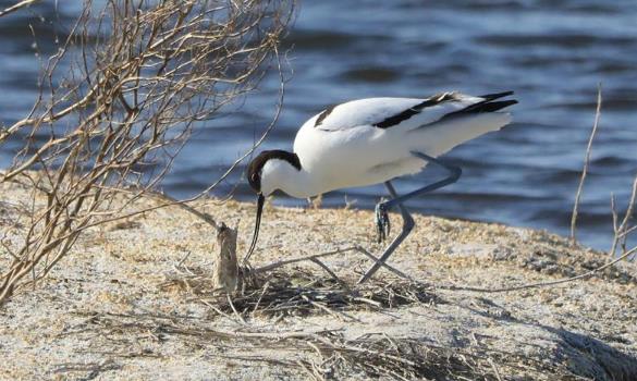 求偶成功后,反嘴鹬选定一处较为开阔的岸边,找个简单的凹坑,衔来枯草和树枝,先用树枝坐框,底部铺干草。